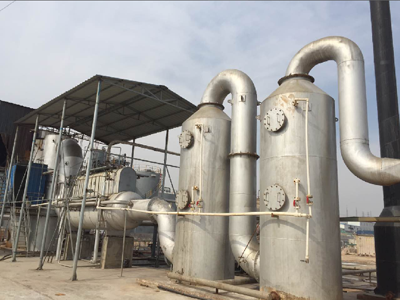 廢液和壓縮空氣經(jīng)管路控制系統(tǒng)進(jìn)入霧化系統(tǒng),廢液霧化后噴入燃燒室,并依次通過(guò)迷宮除塵室和二次燃燒室,廢液中的有機(jī)物被焚燒,水分被蒸發(fā)。焚燒產(chǎn)生的高溫?zé)煔膺M(jìn)入空氣換熱器,然后依次通過(guò)兩級(jí)急冷、吸附塔,煙氣中的微小粉塵及有害物質(zhì)(SO2、HCl等)被捕集吸收,經(jīng)處理后的干凈氣體由引風(fēng)機(jī)引入煙囪,排入大氣。